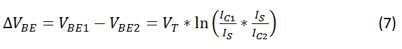如果兩個電晶體的集電極電流差異較大,則VBE不會完全彼此抵消。等式7闡述了電晶體兩個VBE之間的差異: