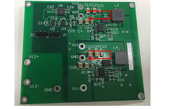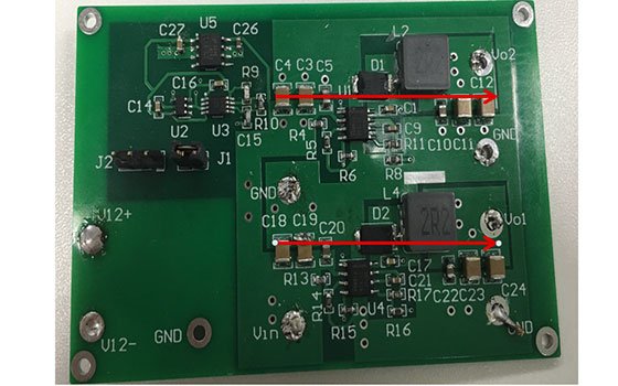 以LMR14030-Q1構成的兩路輸出降壓轉換器DC/DC降壓變換器為例,如圖1和圖2所示的兩種不同的印刷電路板(PCB)佈局。紅線顯示的是功率回路在佈局中的流動方式。圖1中功率回路的流動方向呈U型,而圖2中的流動方向呈I型。這兩種佈局是汽車和工業應用系統中最常見的佈局。那麼,哪一種佈局更好呢?