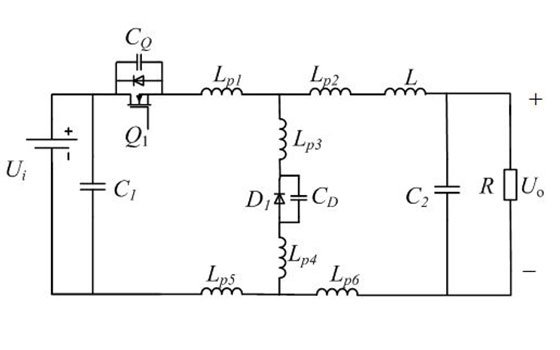 圖3是降壓變換器的等效電路。大多數設計人員都知道如何儘量減小高頻回路中Lp1、Lp3、Lp4和Lp5的寄生電感,但忽略了Lp2和Lp6。對於兩種不同的佈局U型和I型,U型佈局的Lp2和Lp6上的寄生電感相較於I型佈局更小。在U型佈局中,減小開關管Q1導通時的功率回路也將有助於提高EMI性能。