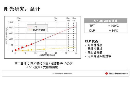在85°C的環境溫度下,由於其低光譜吸收和高工作溫度的特性,HUD系統中採用DLP技術的Kuraray散射屏可以承受高達82kW/m2的太陽輻照度。這種熱性能使DLP技術能夠支援AR HUD中的長虛像距離。