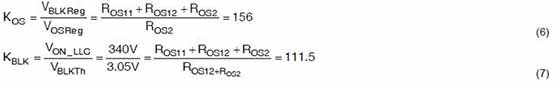 為了適應UCC28056和UCC25630x的不同電阻分壓比,需要兩個電阻抽頭。將PFC儲能電壓設置為390 V時,VOSNS分壓比KOS等於156,如等式6所示。KBLK由LLC預期打開時的最小PFC儲能電壓決定。當儲能導通閾值為3.05 V,所需的導通閾值為340 V時,BLK分壓比KBLK等於111.5,如等式7所示: