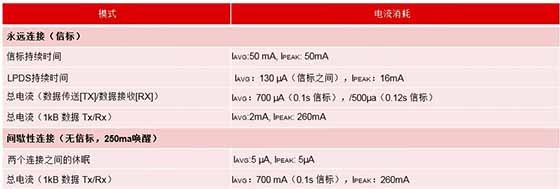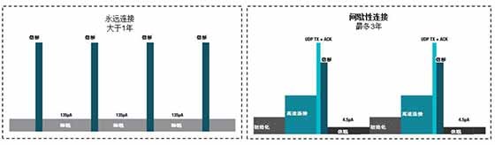 • 設備可以設置為“間歇性連接”模式,這能使以較長間隔(≥10s)傳送資料的應用的功耗降至最低。不過,在此種模式下,AP不能請求資料,資料請求由STA發起。STA需時~250 ms喚醒並建立連接。