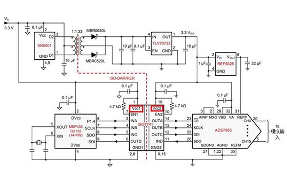 數位隔離器需要初級和次級側電源。在圖3中,隔離電源為ADC以及連接ADC的數位隔離器的“場側”供電。