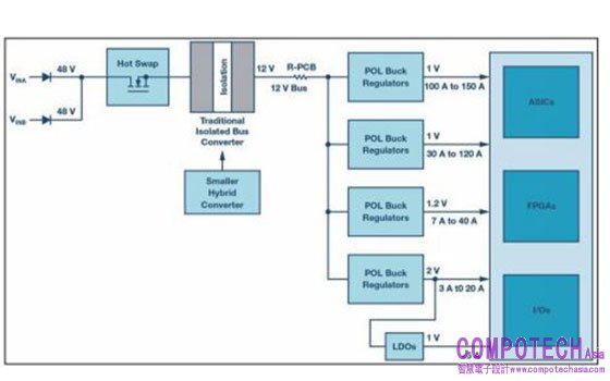 圖:傳統的電信板電源系統架構帶有隔離式匯流排轉換器。在 48V 已經與交流電源隔離的系統中,無需使用隔離式匯流排轉換器。使用非隔離混合式轉換器取代隔離式轉換器可顯著簡化設計、降低成本和電路板空間要求。