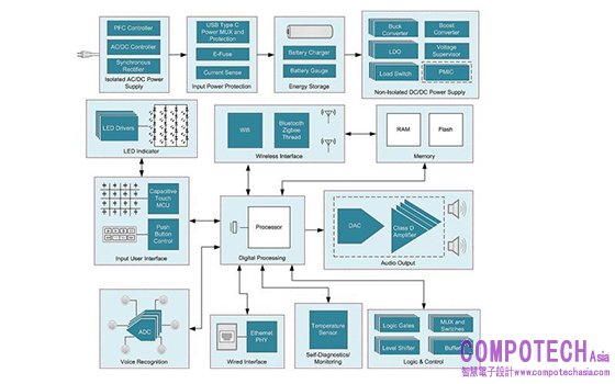 由於這些音箱通常放置在床頭櫃或書桌上,交流電源可輕鬆獲得,因此電池電源並非是必不可少的。但是,考慮到這些音箱的位置,增加電池充電功能則具有重要意義,可以通過USB或無線方式為智慧手機和智慧手錶充電。最後,消費者需要可以在這些位置連接並控制燈光、恒溫器和安防系統。