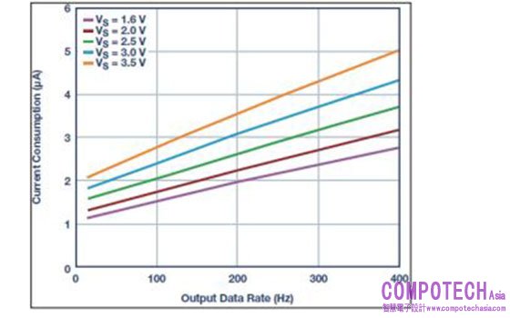 圖 1:ADXL362 電源電流與輸出資料速率的關係。