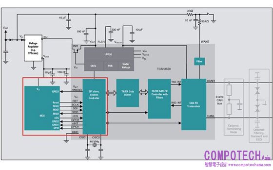 圖:紅色框框中顯示與處理器 / 設備連接的 TCAN4550-Q1 圖例