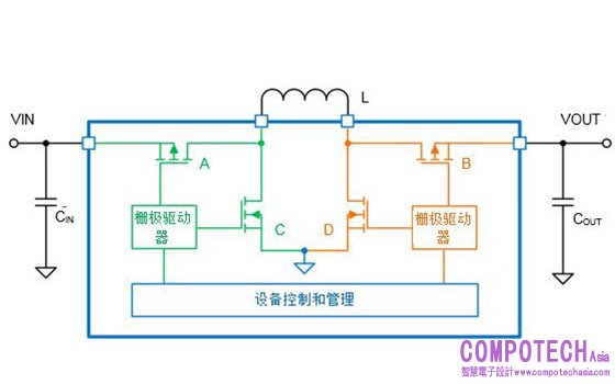 降壓-升壓轉換器將降壓轉換器(圖1中的綠色部分)與升壓轉換器(圖1中的橙色部分)合併在同一結構中,從而可以有效地升高和降低輸出電壓。控制環路可以根據實際的輸入電壓和程式設計設定的輸出電壓來決定設備是否需要在降壓或升壓模式下運行。