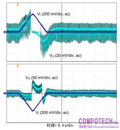 降壓-升壓轉換器的第二個常見用途是用作電壓穩壓器。如果電源軌有變化(如3.3V±10%變化),而負載需要更精確的調節電壓(如3.3V±5%容差)時,那麼就需要一個可以穩定電壓的降壓-升壓轉換器。如果元件對電源電壓敏感(例如光學模組中的跨阻放大器);如果其他DC/DC預調節器在工業應用中調節不夠嚴密;或者如果電源路徑中的其他元件(如電熔絲、負載開關或長電纜)根據電流增加電壓變化,則可能需要更嚴格地調節電壓。只用升壓轉換器或降壓轉換器不能解決此問題。然而,降壓-升壓轉換器能夠將不斷變化的輸入電壓調節到所需的更嚴格的限值。圖3所示為TPS63802對快速±0.5 V/10 µs線路做出的瞬態回應,帶有明顯小於±0.1V輸出電壓下沖/過沖。