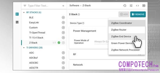 SysConfig的器件視圖對於具有類似資訊級別的自訂硬體開發很有用。軟體視圖(如圖2中所示的Z-Stack配置視圖)提供了可配置參數的總覽,並顯示每個參數的選項清單(在此示例中為Zigbee器件類型)。只需按一下滑鼠,即可將預設設置從Zigbee連接器更改為Zigbee終端器件。用滑鼠懸停在“?”圖示上,將顯示有關這些參數的更多詳細資訊,而更新後的軟體將顯示在預覽窗格中。在此初始版本中,SysConfig支援大多數SimpleLink™MCU的管腳和驅動器配置,包括射頻(RF)參數和用於Wi-Fi®、乙太網、Bluetooth®、Zigbee®、Thread、15.4和EasyLink的有線和無線通訊技術的堆疊的配置。它還支援多協定配置。您可輕鬆更新默認設置,以快速找到適合您的用例的RF和堆疊設置的最佳組合。您還可將參數匯出到其他TI工具,包括TI的Smart RF™Studio,以進行進一步的測試和調整。