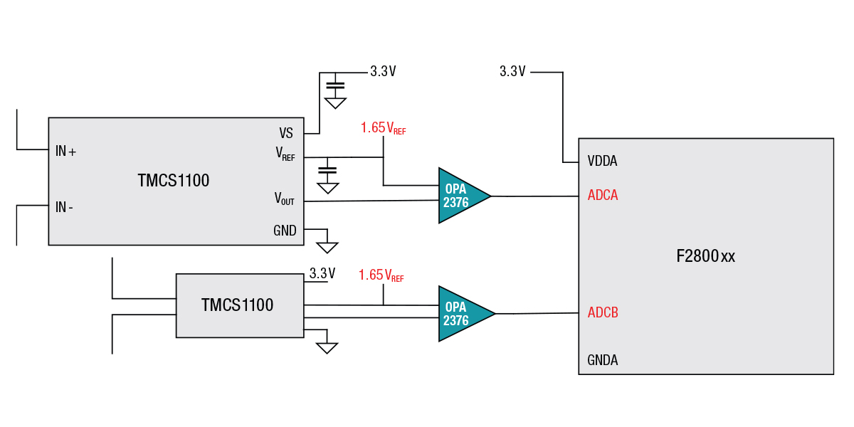 圖1展示了,在分別使用3.3 V和5 V供電情況下,霍爾效應電流感測器的典型應用電路。與使用3.3 V電源供電相比,使用5 V供電可用拓寬霍爾感測器的電流檢測範圍。以TMCS1100A1為例,霍爾感測器的靈敏度為50 mV/A:如果使用3.3V電源,則電流檢測範圍為-33 A〜+ 33 A(雙向);而使用5.0V電源時,電流檢測範圍可以擴展到-50 A〜+ 50A。另外,在設計中應當注意,除了電流檢測範圍之外,還需要考慮感測器的連續電流耐受能力,當電流耐受力不足時,可以通過改善感測器的散熱來優化。