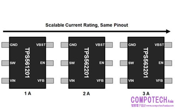 所謂可擴展性的系列裝置,意指各裝置的引腳對引腳相容,且系列中每項裝置接腳相同,如圖一所示,換言之,若您需要將額定電流10A的器件更換為額定電流為20A 的器件,只需移除 10A 裝置,再裝上 20A 裝置,不需重組或大幅更動電路板配置;亦可繼續運用同系列裝置的各項特性,如外部零組件數量少、可堆疊性與PMBus協定等。總而言之,可擴展性的系列產品,服務更廣泛,而非僅限一兩個應用。