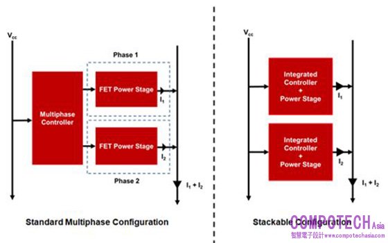 在設計中採用堆疊配置,可擴展性會更加有利,因為高電流應用(>80 A)通常無法使用單個積體電路(IC)進行維修,若具備可堆疊性,即可將多件DC/DC轉換器並聯,從而構成一個具有綜合輸出額定值的多相位變壓器解決方案,其總額定輸出電流為堆疊晶片額定電流之總和。例如,若堆疊 10A 器件及 20A器件,負載點即可處理 30A的電流 。此種應用一般需要一個DC/DC控制器及多路功率級,但堆疊配置能將兩項及以上的變壓器輸出綁在一起,縮小整體設計面積,如圖二的標準架構使用三個IC,而可堆疊架構只用兩個IC。