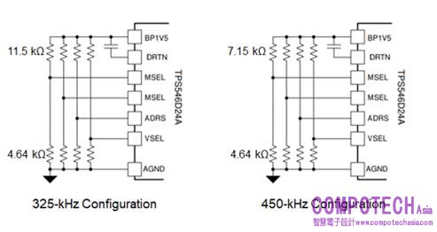 圖三: 用兩種不同的引腳複用配置來改變TPS546D24A的 開關頻率