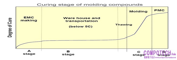 解凍是在塑封成型前EMC準備過程中的一個重要程序,可以防止模封材料變質和性能下降,影響積體電路(IC)的品質和可靠性。EMC對外部環境條件敏感,因為固化度受到環境條件影響。EMC固化通常分為四個階段,解凍是EMC出廠後運輸到倉庫冷藏階段B的末段,如圖所示。