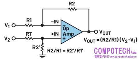 用於放大精密差模訊號的基本拓撲是差動放大器(圖3)。差動放大器接受差分輸入訊號,抑制共模電壓(VCM),放大差分輸入電壓(VDIFF),並輸出與兩個輸入電壓之差成比例的放大單端訊號。其傳遞函數為VOUT = G × (VDIFF),其中VDIFF為(V2 – V1),G為放大器電路的增益,等於比率(R2/R1)。