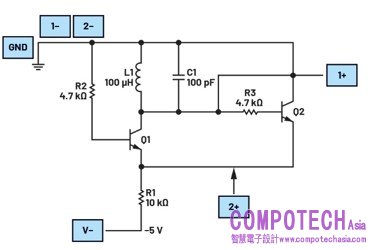 在此振盪器配置中,LC諧振電路的峰對峰值擺幅很有限。當Q2的基極電壓正向擺動至高於地電位時,Q2的集電極(集電極基極結)將正向偏置。這會將最大正擺幅限制在大約一個二極體正向壓降的範圍內。峰值負擺幅也是此種情況,此時Q1的集電極負向擺動夠大,以使Q1的集電極基極結正向偏置。當BJT電晶體的集電極基極結正向偏置時,基極電流急劇增大。我們可以利用該增大的基極電流來提高LC諧振電路的峰對峰值擺幅。如果在Q1和Q2的基極插入串聯電阻,如圖2所示,在LC諧振回路電壓達到極限時,流經電阻的新增電流會降低Q1和Q2的基極電壓。