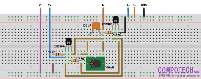 在無焊試驗板上建構圖3所示的Peltz振盪器電路。方塊表示連接ADALM2000模組示波器通道和電源的位置。務必反覆檢查接線之後,再打開電源。