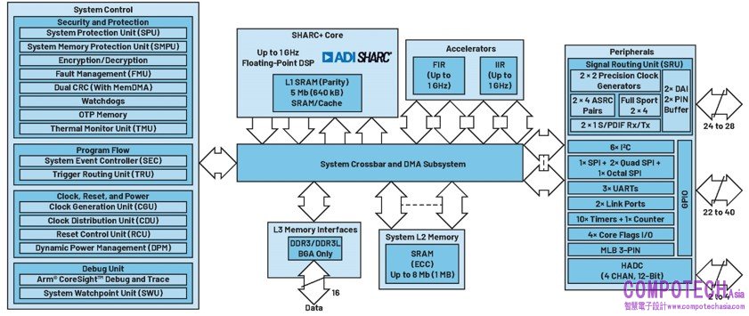 ADSP-2156x系列(ADSP-21562/ADSP-21563/ADSP-21565/ADSP-21566/ADSP-21567/ADSP-21569) DSP目的在為汽車及消費性/專業音訊應用領域提供身歷其境的音訊和音效體驗。ADSP-215xx系列處理器基於SHARC+單指令多資料(SIMD)核心,運行時脈頻率高達1 GHz。