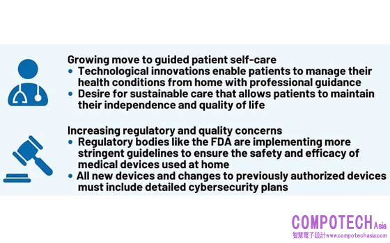 本文以「一次性醫療用品的安全認證」中描述的一次性醫療用品安全認證為基礎,探討醫療保健日益從醫院轉移到患者家中的趨勢(圖1),並討論在醫療設施之外提供醫療保健服務的獨特安全挑戰,以及探討在網路傳輸過程中保護資料安全的相關要求。