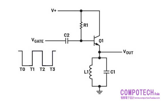 要瞭解此電路的工作原理,首先可假設LC諧振電路的Q值夠高,能夠防止阻尼。當輸入閘控脈衝呈負跳變時(T0到T1和T2到T3期間),電路會產生輸出。其餘時間(T1到T2)電晶體深度導通,電路則無輸出。輸入閘控脈衝的寬度用於控制輸出訊號的持續時間。閘控脈衝越寬,輸出振盪或振鈴的時間便越長。