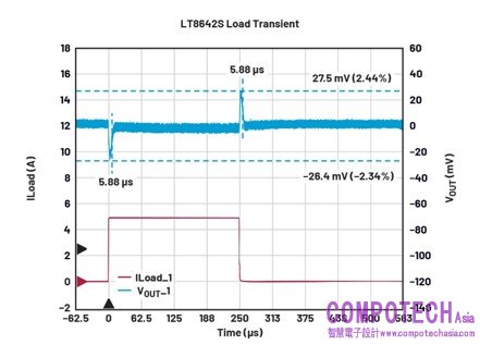 圖2顯示了LT8642S的負載瞬變。負載電流在500 ns內從100 mA提高到5 A,並在250 µs後又迅速降低。電壓峰值約為27.5 mV,電壓穀值約為26.4 mV。