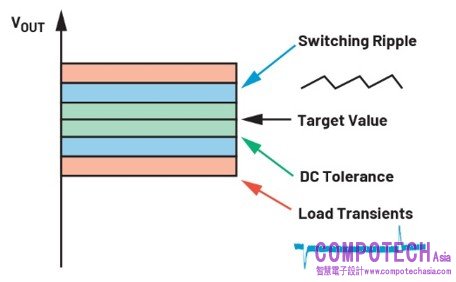 直流容差還包括穩定輸出電壓與回饋接腳之間的電阻分壓器的電阻值偏差(圖1中的Rfb1和Rfb2)。這類電阻有多種容差規格可選。通常,電阻的容差值接近規定的最大容差。在生產過程中,容差較小的優質電阻會被篩選出來,作為高精度電阻出售。