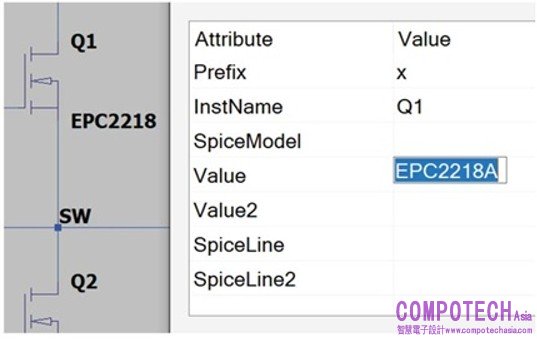 圖1. 基於GaN的LTspice示例電路,EPC2218 FET作為子電路模型加以引用