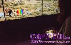 圖說:故宮與資策會合作「藝域漫遊-郎世寧新媒體藝術展」今(15)日開展;圖為民眾透過智慧型行動載具,利用數位著色與郎世寧〈百駿圖〉互動,體驗郎世寧筆下的藝術新境界。
