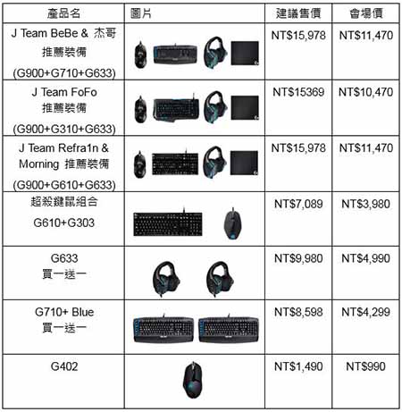 此次羅技特別與J Team合作,推出地表最強「BeBe & 杰哥推薦裝備」、「FoFo推薦裝備」和「Refra1n & Morning推薦裝備」,除了祭出買一送一的超殺的組合價格(參考表一),玩家還能參考J Team是使用哪些電競利器奮勇奪冠,進而體驗羅技G系列的專業效能。此外,Logitech G也首度亮相最新機械遊戲鍵盤G610 ORION BLUE,現場並打造大型極限電競體驗區,電腦指定裝備為MSI微星超強電競主機板、顯示卡、電競筆電、桌機/AIO以及PLEXTOR M7固態硬碟和三星24吋電競曲面螢幕,為現場玩家獻上電競界的超強夢幻裝備組合。