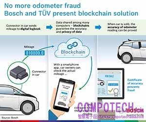 博世執行長鄧納爾特別提出區塊鏈的應用實例,並現場操作與德國認證權威機構 TÜV 萊茵集團合作的案例。區塊鏈科技可終結日益猖獗的里程表造假事件,因車輛里程表造假在德國導致損失的金額就達到 60 億歐元。打擊里程表造假的構想是將數位日誌傳輸到多部電腦,汽車則透過連接器定期把里程表讀數傳輸到這些電腦。透過智慧型手機應用軟體,車主可隨時查詢里程表實際讀數,並核對車上儀表板讀數是否正確。在車輛轉賣時,車主可獲得里程表證明書,證明車上里程表數據正確無誤,也可將里程表證明書透過網路上傳至中古車買賣平台。