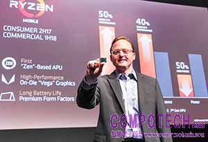 此外,AMD還首度公開展示採用Ryzen™ Mobile APU的超便攜式參考設計,在一台厚度不到15公釐的筆記型電腦設計搭載4核心8執行緒與基於「Vega」架構的繪圖卡,並現場播放HD影片內容。