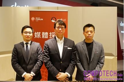 紅帽台灣、香港、澳門暨中國華南區區域總經理文志鋒(中)、紅帽大中華區市場總監趙文斌(右)與紅帽台灣業務總監徐世安(左)共同出席13日紅帽2017高峰論壇記者會。