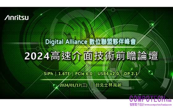 由 Anritsu 安立知主辦的「Digital Alliance 數位聯盟夥伴峰會 – 2024 高速介面技術前瞻論壇」特別邀集了 TSRI 台灣半導體研究中心、GRL 技流科技、MPI 旺矽科技、Tektronix 太克科技與 Teledyne LeCroy 特勵達科技等業界頂尖夥伴共同與會,會中將全面分析 SiPh (Silicon Photonics) 市場趨勢、半導體 on-wafer測試、高速接頭與高速光電 cable 驗證以及系統端 I/O介面驗證,並針對其規格與未來的測試挑戰進行介紹,深入剖析高速訊號在時域及頻域所將面臨的訊號完整性問題。Anritsu 安立知誠摯歡迎您的蒞臨,親身體驗 SiPh、1.6T Ethernet、PCIe 6.0、USB4 v2.0 及 DisplayPort2.1 等最新量測技術解決方案!