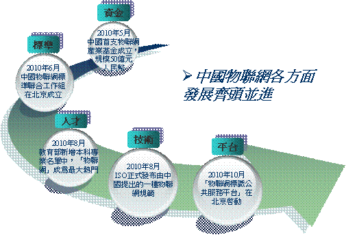 政府的呐喊與力推使物聯網在中國各地得到普遍重視。從全中國層面看,十二五發展規劃和七大戰略性新興產業發展規劃中,物聯網都成為關鍵字;從地方來看,無錫、深圳、廣州、上海等地都在加大資金、加強政策上的支持,希望在物聯網的標準制定、核心技術研發、產業應用等層面獲得突破,實現物聯網產業真正破局。在此背景下,中國物聯網在過去1年多的時間裡發展迅速,在資金、技術、人才等方面都有新的突破,如資金方面,2010年5月大唐電信科技股份有限公司與江蘇物聯網研究發展中心、無錫市國聯發展(集團)有限公司、無錫新區創新創業投資集團有限公司簽署合作協議,共同發起成立總規模為50億元人民幣的「中國物聯網產業投資基金」,這也是中國首支物聯網產業基金。