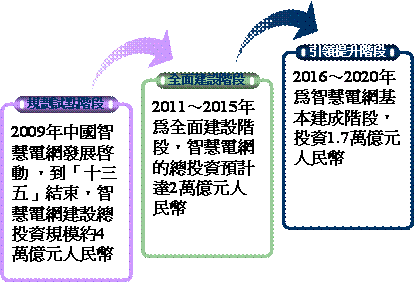 自2009~2020年,中國「堅強智慧電網」將分為3個階段發展,從初期的規劃試點階段到「十二五」期間的全面建設階段,「十三五」時期的引領提升階段,智慧電網建設總投資規模約4萬億元人民幣。2011~2015年為規劃的全面建設階段,此階段投資約2萬億元人民幣,居十大領域之首;2016~2020年智慧電網基本建成階段投資1.7萬億元人民幣。預計到2015年建成50個面向物聯網應用的示範工程,5~10個示範城市,形成核心技術的產業規模2,000億元人民幣,其中感測器100億元人民幣,系統和試驗檢測700億元人民幣,晶片、中間件和集成模組及設備產業的產業規模600億元人民幣,工程實施、服務開發系統和運維600億元人民幣。