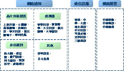 中國物聯網產業鏈經過近幾年的發展已經日益完善,從感測器、晶片、終端、網路到業務都有了相應的企業進入。目前產業聯盟是產業鏈主要的合作形式,營運商是產業鏈的主導,扮演集成商和服務商角色。