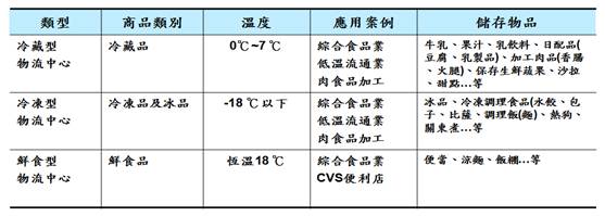 一般而言,物流中心可依據下列幾項原則來分類,如:成立來源之性質、物流作業型態、配銷通路結構、服務對象、物流中心倉儲溫層功能、市場定位等加以分類,冷鏈物流則以冷凍溫度要求不同而加以分類(如表1所示)。