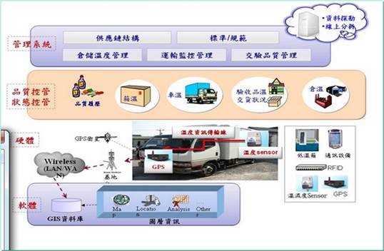 圖1則為冷鏈物流之運作模式,與傳統物流最大之不同處在於,冷鏈在運送過程中為了即刻監控運送食品之所處環境,因此除了低溫運送必備之冷凍庫之外,在個別貨品或是運送鉆板上尚需配置RFID溫度及濕度之標籤,而為了時時刻刻將監控狀態回報給管理中心,GPS及無線通訊設備也是運送載具之必要裝備。