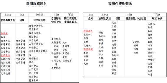 基本上冷鏈乃結合了傳統物流與零組件技術二大體系之業者(如圖二所示),因此雙方必需就客戶服務需求達成有效之整合,例如溫度感應器靈敏度之需求、資料回傳容量及頻率及之通信設備需求、鉆板及物品擺放運送對環境感測之誤差影響…等,皆有賴雙方密切合作以發揮最大之冷鏈經濟效益。