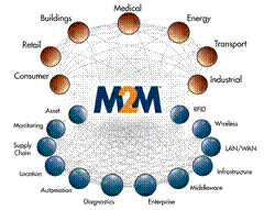 4.感測器: 感測器可分成普通感測器和智慧型感測器(Smart Sensor)兩種。智慧型感測器是指具有感知能力、計算能力和通訊能力的微型感測器。由智慧型感測器組成的感測器網路(Sensor Network)是M2M技術的重要組成部分。一組具備通訊能力的智能感測器以ad hoc方式構成無線網路,協作感知、收集和處理網路覆蓋的地理區域中感知對象的訊息,並發佈給觀察者;也可以通過GSM網路或衛星通訊網路將訊息傳給遠方的IT系統。