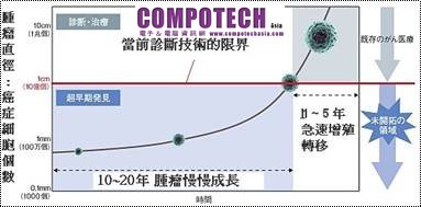 再重申一次。為什麼說,癌症超早期發現的技術會很重要呢?原來是當前的診斷技術,無論是X放射線CT(Computed tomography)電腦斷層掃描、PET(positron emission tomography)正電子放射斷層攝影、MRI(magnetic resonance imaging),都有它的限界存在;也就是約直徑一公分的腫瘤;可是如此大小的癌症細胞可達10億個。而且,一公分的腫瘤也需要10~20年期間緩慢地成長;爾後,1~5年間會快速繁衍增殖與轉移。