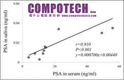 案例二:未來很有機會利用唾液來判定前立腺癌之有無。這是利用了前立腺癌良好標示PSA(prostate specific antigen) - 前立腺特定抗原。考量到血液中的PSA移行到唾液的可能性非常高。因此,不單是前立腺癌患者的血液,唾液也有機會。故,藉由測量唾液中的PSA濃度,很有可能用來判定患前立腺癌之有無。這個技術還需要更大規模的臨床試驗來加以確認,同時高感度的測量技術以及相關零組件也必須確立。