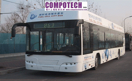 圖3:中國典型的氫氣動力巴士。巴士的屋頂上安裝的儲氫罐。