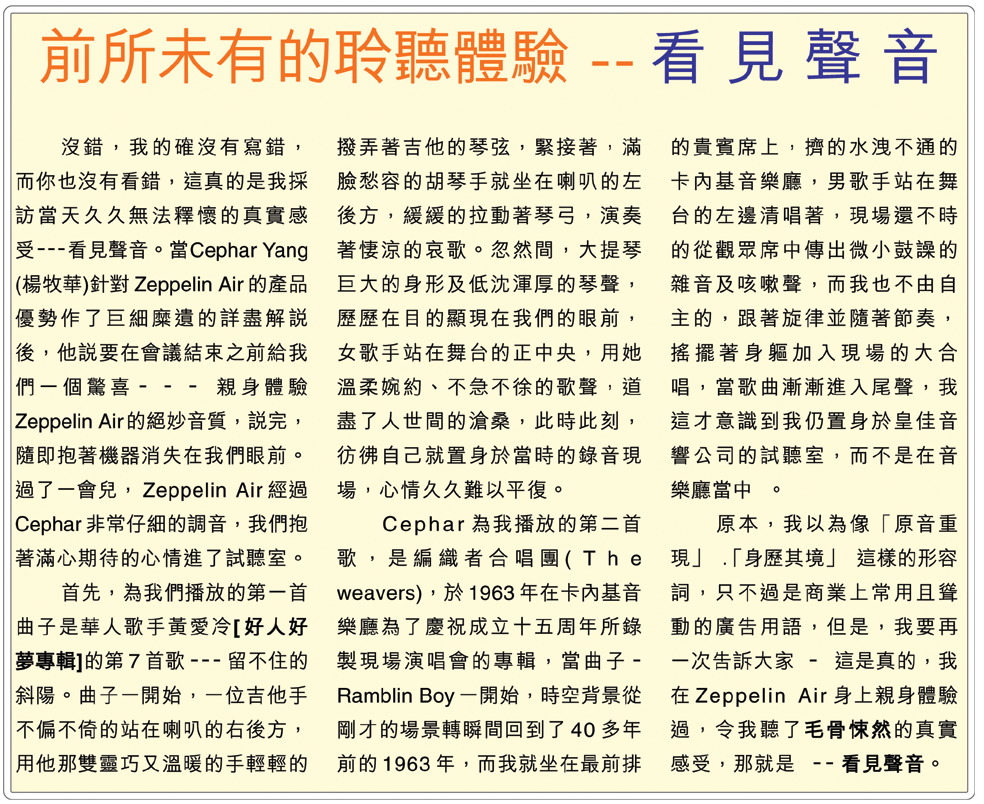 在音訊半導體及High-End音響領域,資歷達20年的皇佳國際公司之音響調音師暨音響工程師Cephar Yang (楊牧華),對於Zeppelin Air 的音質,何以有如此大的躍進做了詳盡的說明: 「最主要的原因是因為全新Zeppelin Air 的創新聲學設計及使用了ADI 功能強大的DSP,讓左右聲道的高音、中音及獨立的超低音共5聲道的頻率訊號,放棄了使用傳統且較耗能的被動元件所構成的分頻網路,並採用高難度且高精密度的ADI DSP來達成電子分音器,所以全部的音樂訊號皆由DSP 精密的分頻過濾出來;而它濾出來的頻率訊號是非常精準的;兩者之間最大的差別就在於Accuracy (精準度) 與Flexibility (設計彈性靈活度) 。更重要的是,在機器內的音樂訊號在被功率放大器放大之前,不同頻段的訊號頻率就已被分頻出來,所以當然就不會有消耗能量的問題產生。因此,在如此優異的ADI DSP 的加持下,自然就造就出B&W Zeppelin Air 的優質音效。