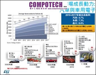 汽車電子在汽車當中的份量越來越吃重 ,從1980年代在3000萬輛車中電子元件只佔5%, 到2010年全球7000萬輛車中,已增加到30%,預計到2020年車用電子比重將達50%。在這麼高的比重下,半導體技術應用在車體上非常廣汎,但重心在於提高安全與節能來提升日常生活品質,例如應用在主動安全系統的CMOS照相攝影感測器,採用0。13微米BiCMOS RF製程的24/77GHz雷達感測器,40奈米CMOS視訊處理器。另外,應用55奈米e-Flash用於汽車微控制器,0.16微米BCD製程的智慧功率晶片用於安全,汽車動力系統,車身和底盤等等。