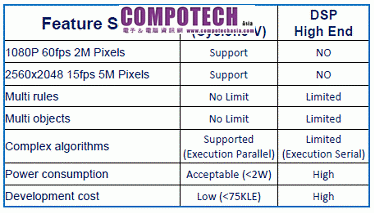 獨的安全元件,一方面保護IP,一方面計算出貨量。這個做法對成本敏感的應用尤其適合。此外,江允貴表示,這是業界首個以寬廣動態範圍IP攝影機佈署的解決方案,在效能上媲美高階的DSP,以附表為例,目前DSP在支援複雜的演算法均採串行處理而非平行處理,功耗與成本都相對Altera提出的方案來得高。
