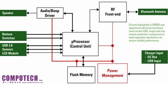 過電壓和過電流保護元件的使用便是一個關鍵的設計考慮因素。 必須要考慮的主要子系統包括通信介面、直流輸入/充電電路、電池組、傳感器、液晶顯示器、鍵盤、和按鈕。