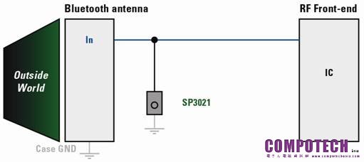 如圖1所示,一個手持式儀器的無線(射頻)介面可能受到經由其天線而引發的靜電放電突波的危害。 圖2中的電路說明了一種基於半導體技術的靜電放電解決方案,能保護藍牙電路的射頻放大器輸入模組免受靜電放電威脅。這種保護元件是一個0.5pF(以保持信號的完整性)分離二極體,能提供低箝位電壓以保護敏感的射頻前端。