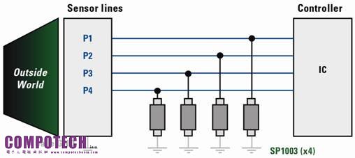 儀器的傳感器輸入(例如,從血糖儀的驗血條到控制器IC)是用戶和測量電路之間的介面。 這種輸入同樣使得該儀器易於發生靜電放電損壞,因為該傳感器被連接到或以某種方式與用戶接觸。如圖3所示,分離式二極體能在這種電路中加以使用(在該例中顯示了四條線路)。 這些元件已經顯示出具有較低箝位電壓、以及非常低的漏電流(< 100nA),且能確保傳感器電路接收到足夠的信號以作出準確的測量。